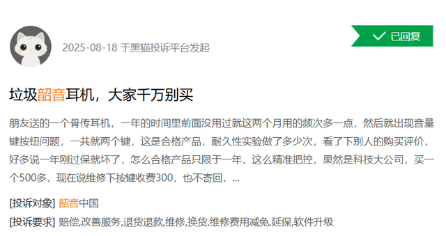 DoNews8月26日消息,在新浪黑猫投诉平台,近期不少消费者投诉自己购买的韶音耳机遇到诸多问题。包含设计缺 ...