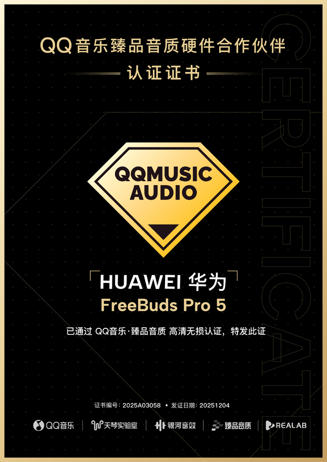 华为 FreeBuds Pro 5真无线耳机通过QQ音乐臻品音质认证