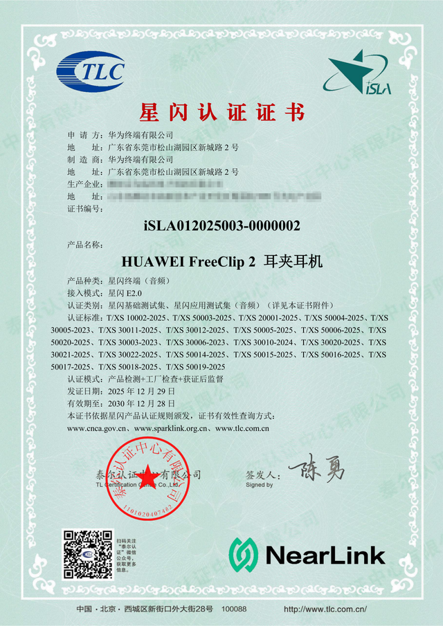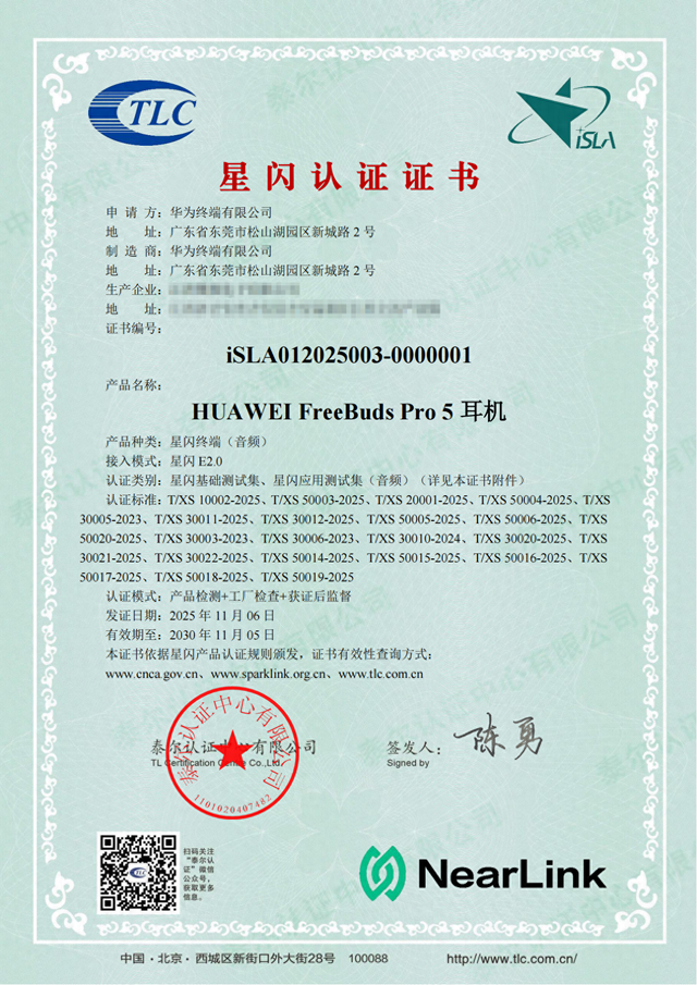 业内首批,华为FreeBuds Pro 5、FreeClip 2耳机获星闪认证证书